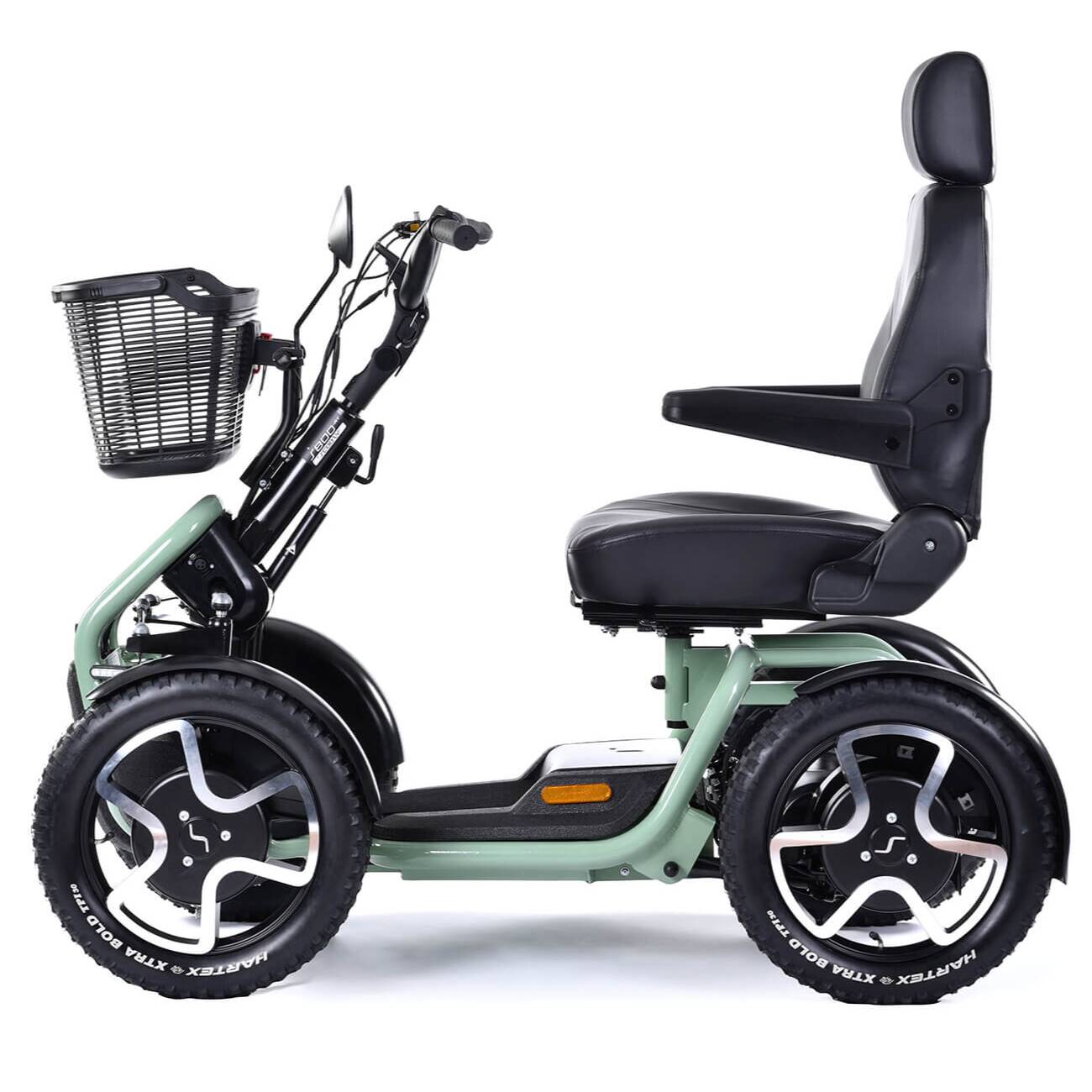 The STERLING S800 by Scoozy effortlessly transitions you from biking to a mobility scooter, with fimilair bike-style handlebar controls, 4 large wheels, advanced suspension, and a lithium battery. Engineered for stability and comfort on both urban streets and nature trails, the S800 delivers a modern and cool mobility solution.